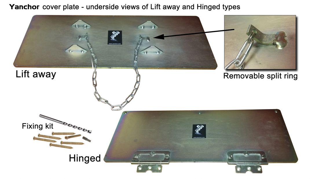 A choice of either a permanent fixed hinged access cover or a removable cover that can be lifted away and totally removed and stored away or can be attached with the chain provided to the Y anchor.